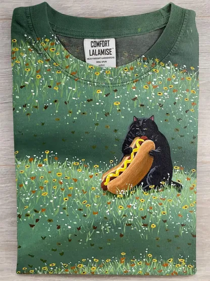 Retro Flowers Cat Art Print Casual Pure Cotton Short Sleeved T-shirt