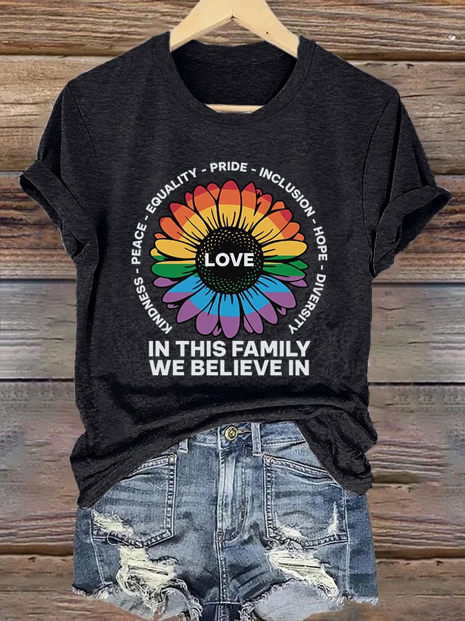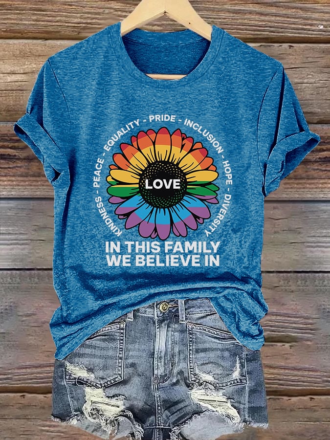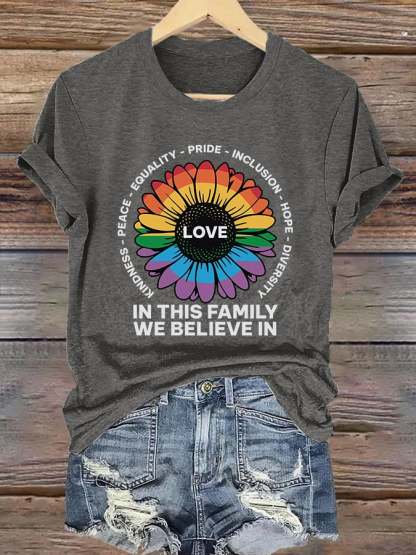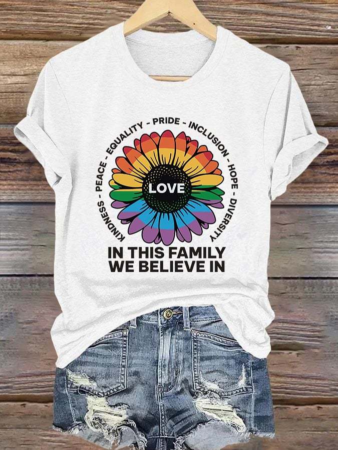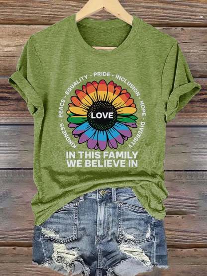 Retro Love In This Family We Believe In Kindness Peace Equality Pride Inclusion Hope Diversity Print T-Shirt