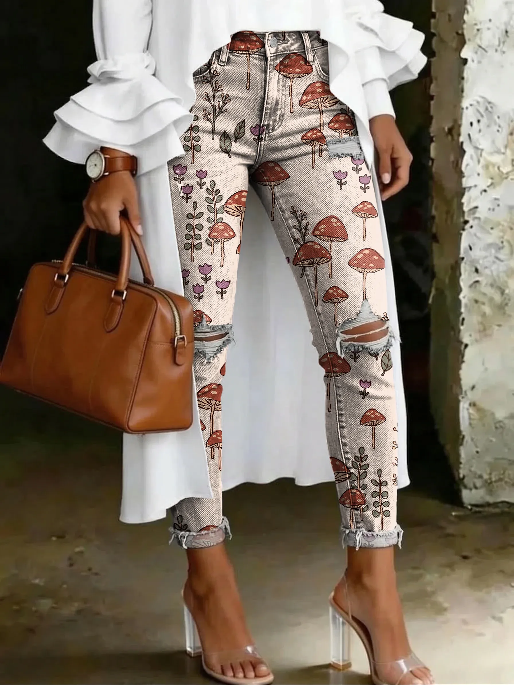 Retro Mushroom Floral Art Print Casual Ripped Skinny Jeans