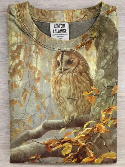 Retro Owl Fun Art Print Casual Pure Cotton Short Sleeved T-shirt