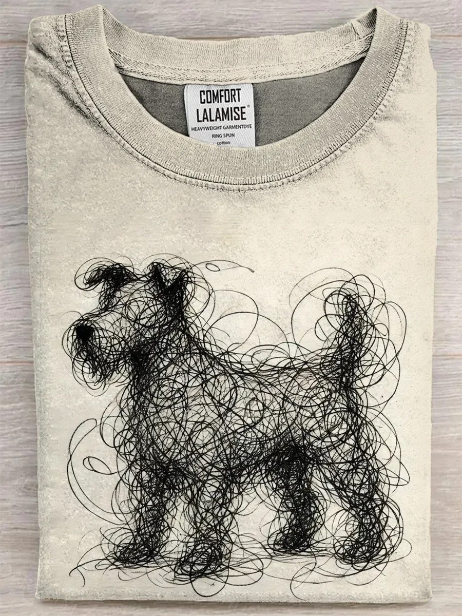 Retro Pencil Drawing Dog Art Print Casual Pure Cotton Short Sleeved T-shirt