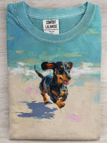 Running Dachshund Dog Art Print Casual Short Sleeve T-shirt