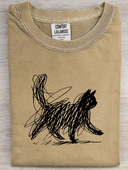 Scribble Cat Art Print Casual Short Sleeve T-shirt