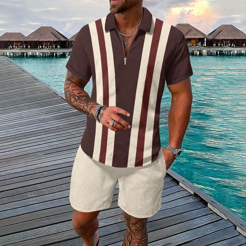 Simple Color Block Striped Print Short Sleeve Polo Set