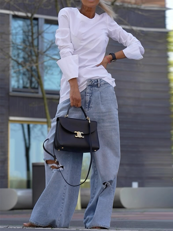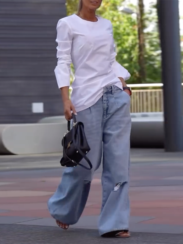 Solid Color Long Sleeves Loose Round-neck T-Shirts Tops