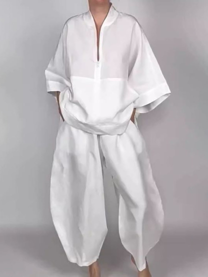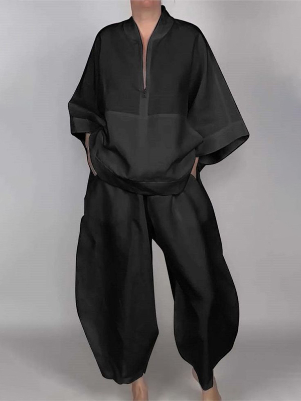 Solid Color Zipper Long Sleeves Loose V-neck Shirts Tops