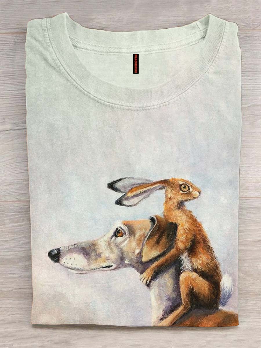 The Little Dog And Its Rabbit Print Casual T-shirt