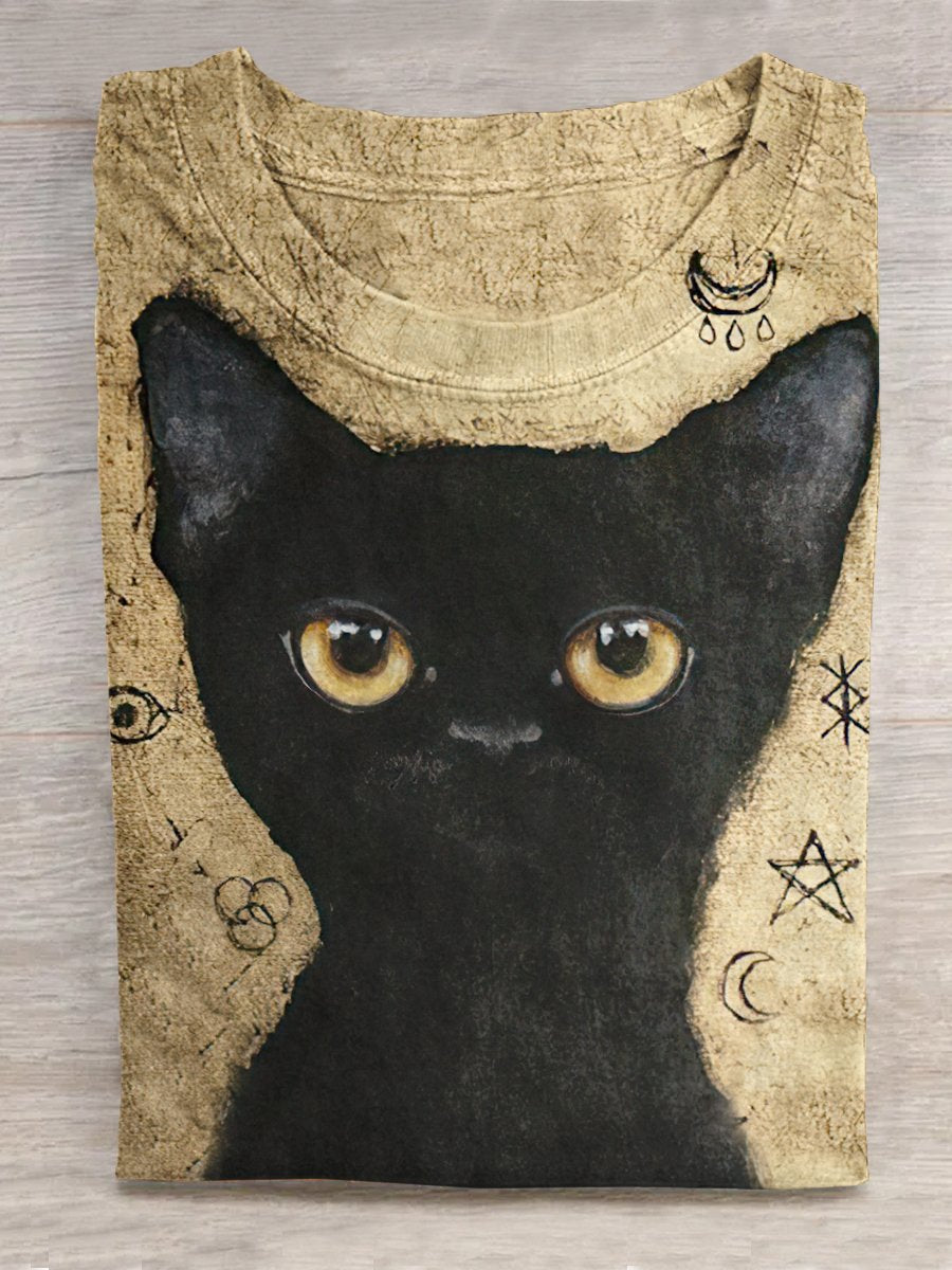 Unisex Retro Cat Print Round Neck Short Sleeve T-Shirt