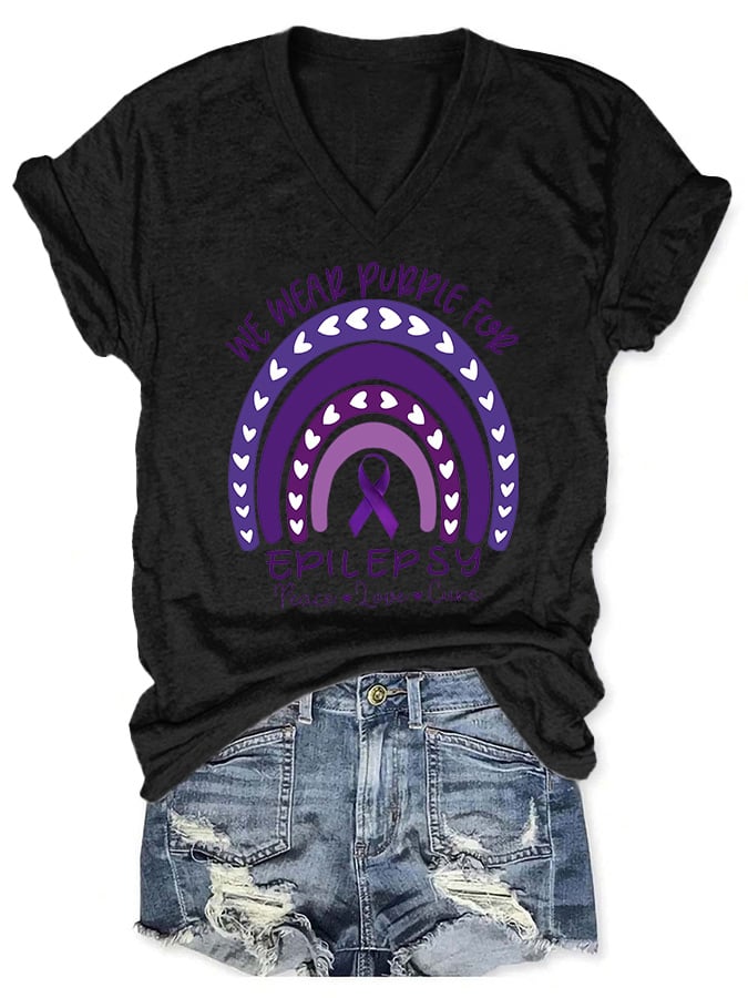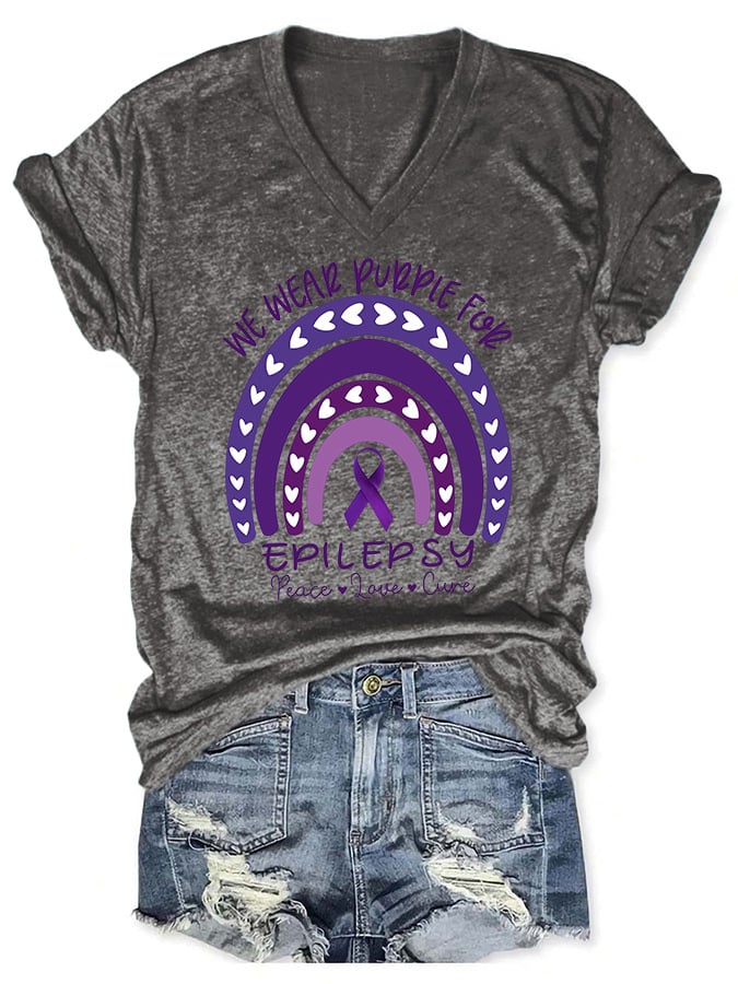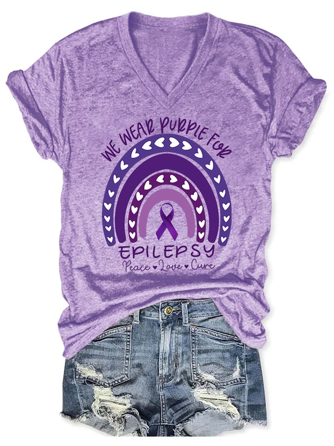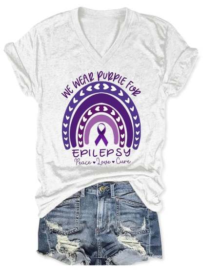 V-neck Epilepsy Awareness We Wear Purple For Epilepsy Peace Love Cure Print T-Shirt