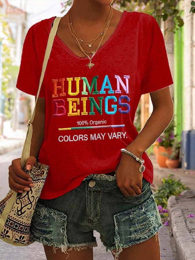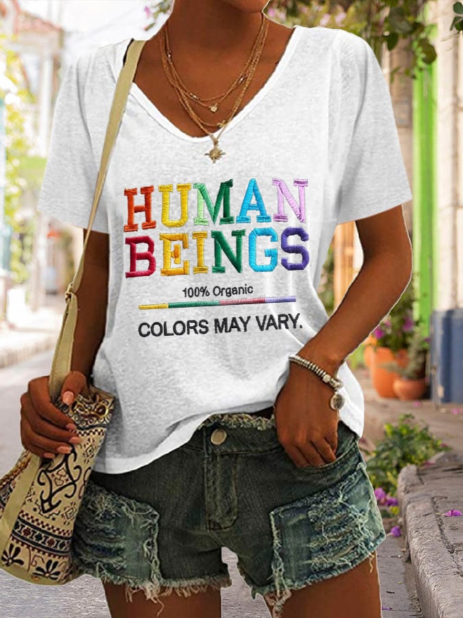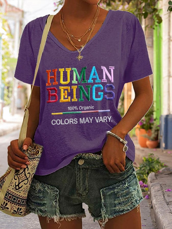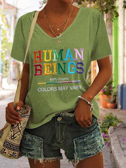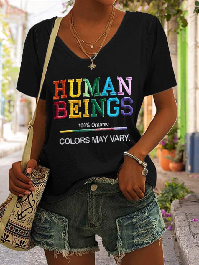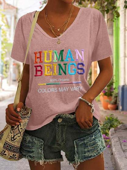 V-neck Human Beings 100% Organic Colors May Vary Human Rights Equality Pride Print T-shirt