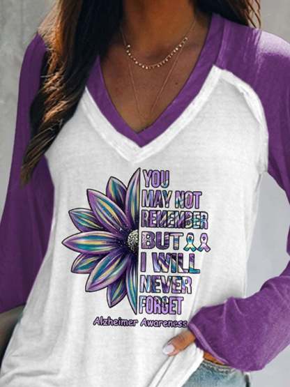 V-neck Retro Alzheimer's Awareness You May Not Remember But I Will Never Forget Print T-Shirt