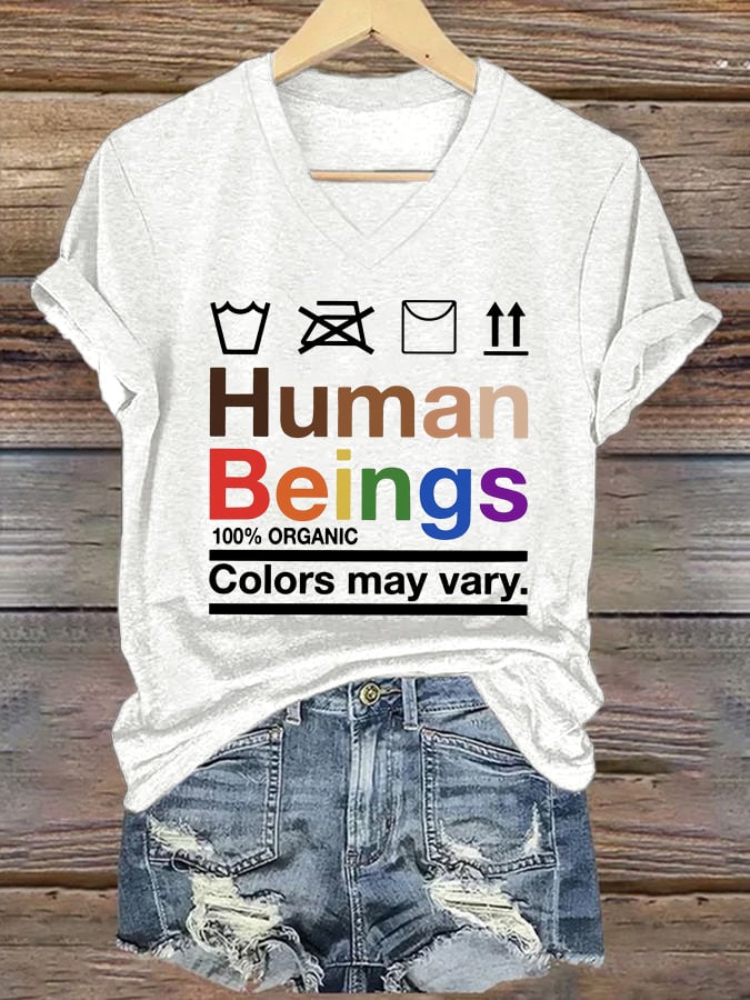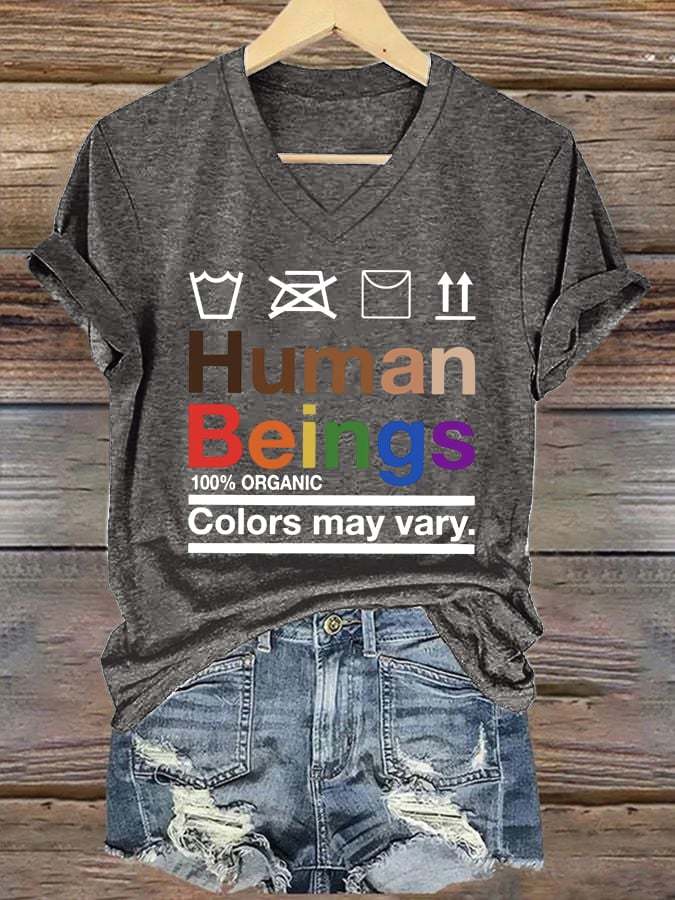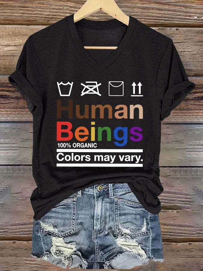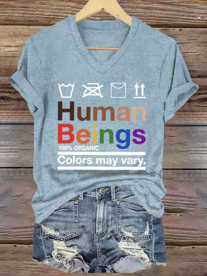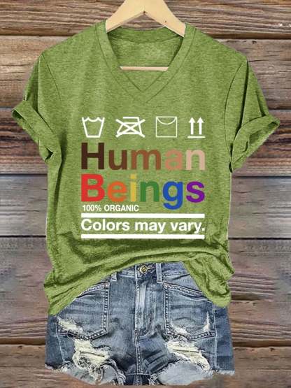 V-Neck Retro Human Beings 100% Organic Colors May Vary Human Rights Equality Pride Print T-Shirt