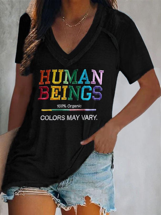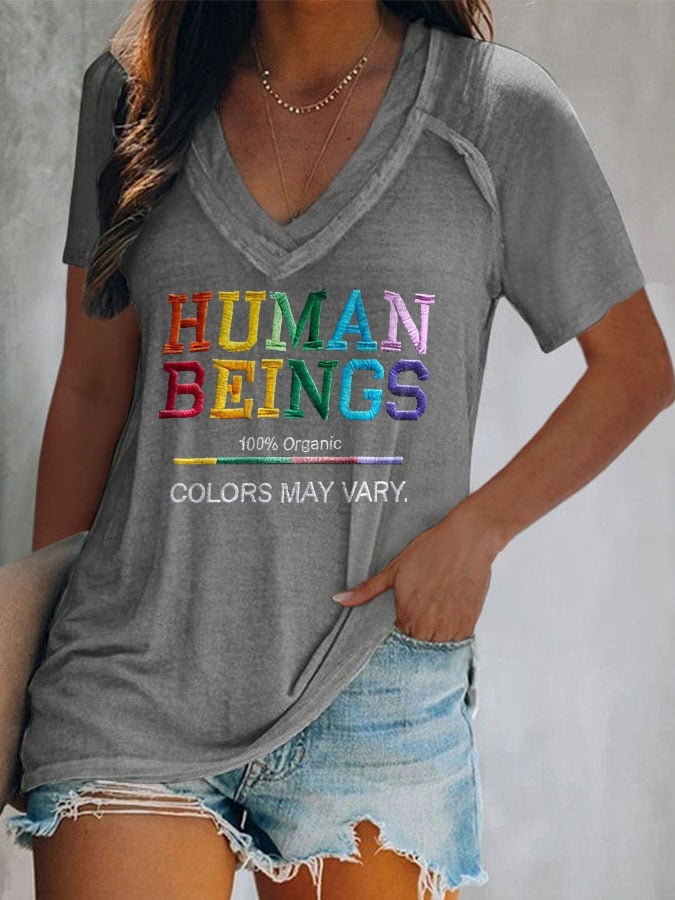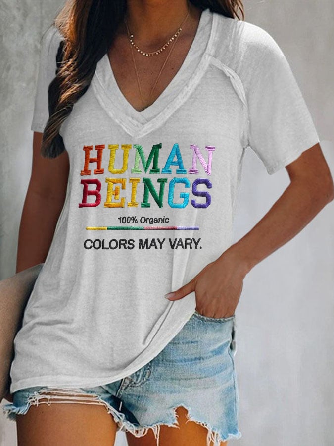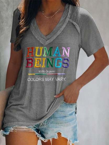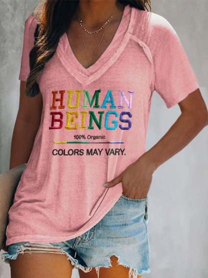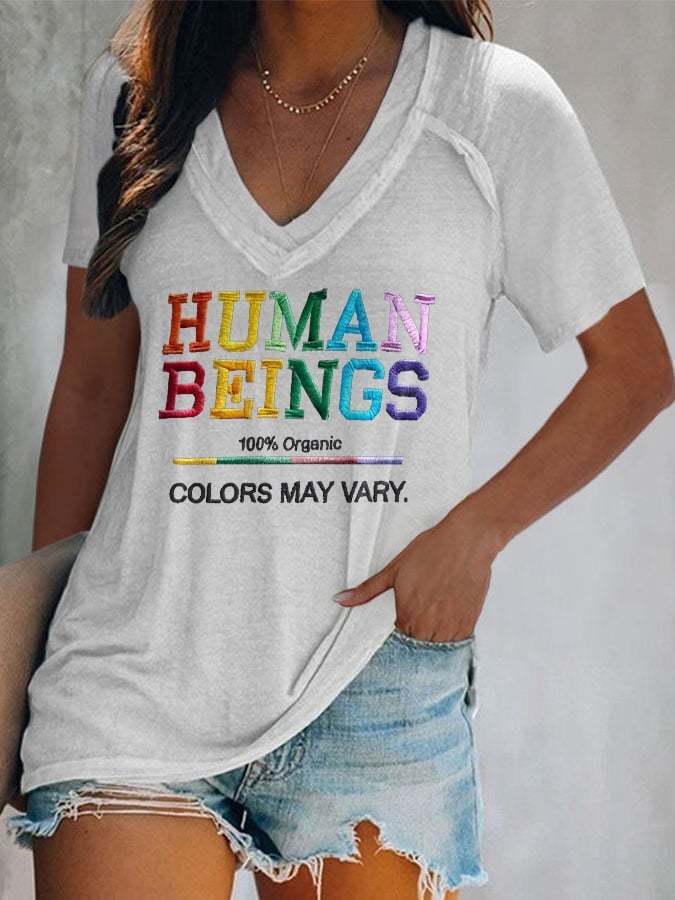 V-Neck Retro Human Beings 100% Organic Colors May Vary Human Rights Equality Pride Print T-Shirt