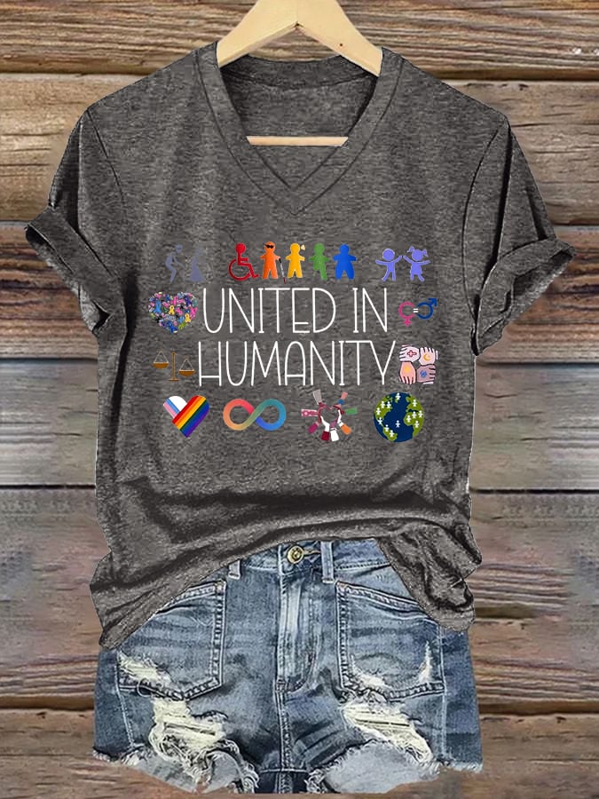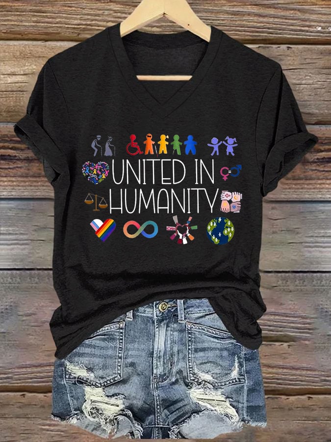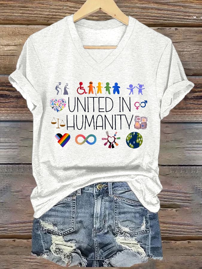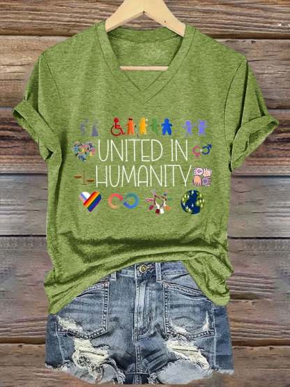 V-Neck Retro United In Humanity Diversity, Inclusion, Disability, Neurodiversity, Equality, Advocacy Print T-Shirt