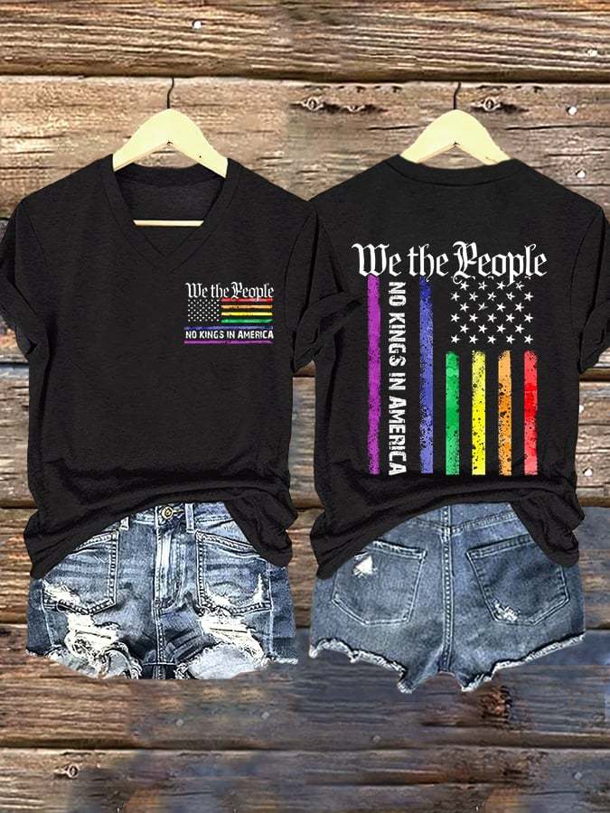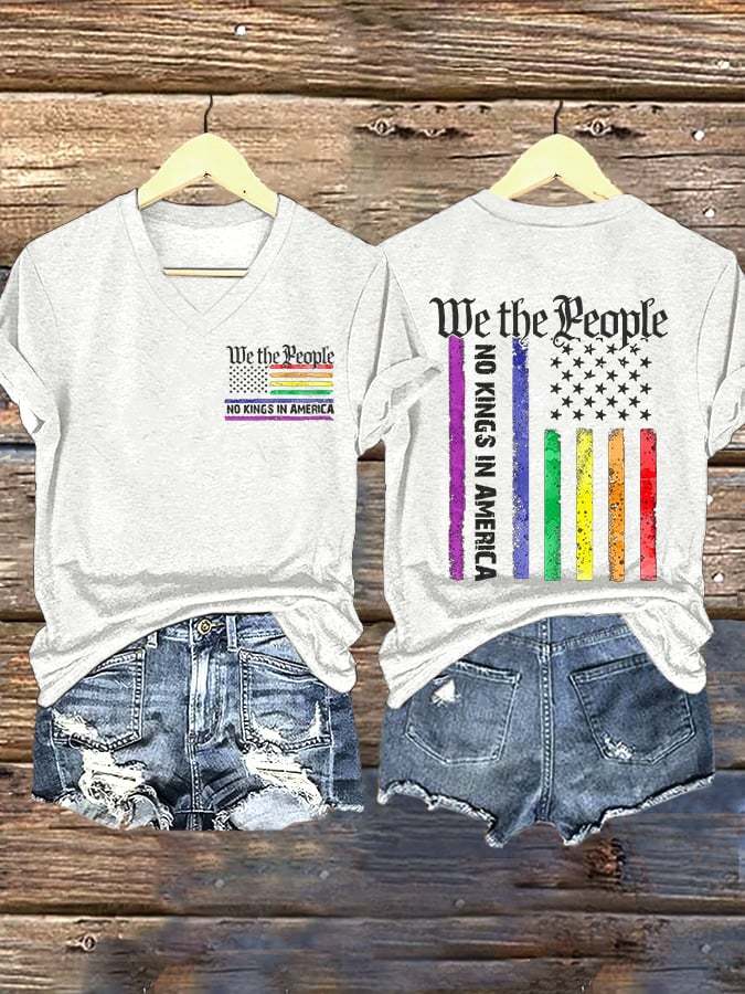 V-Neck Retro We The People No Kings In America Print T-Shirt