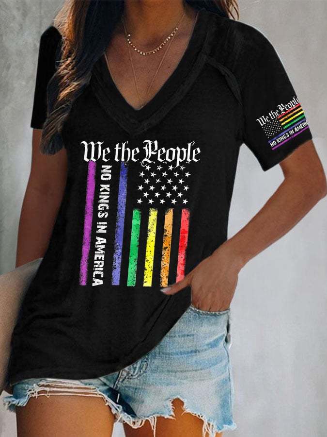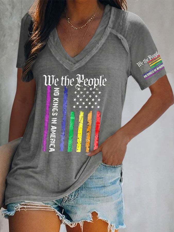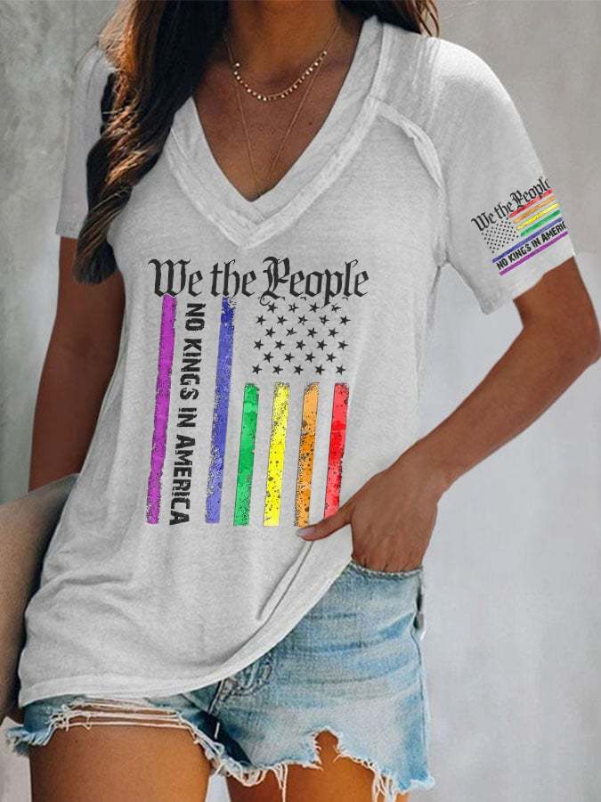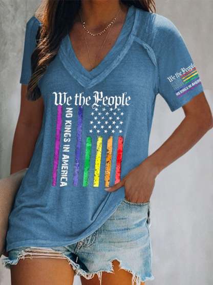 V-Neck Retro We The People No Kings In America Print T-Shirt