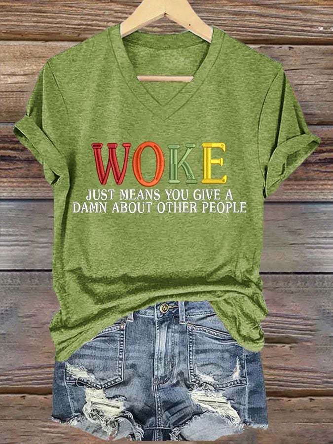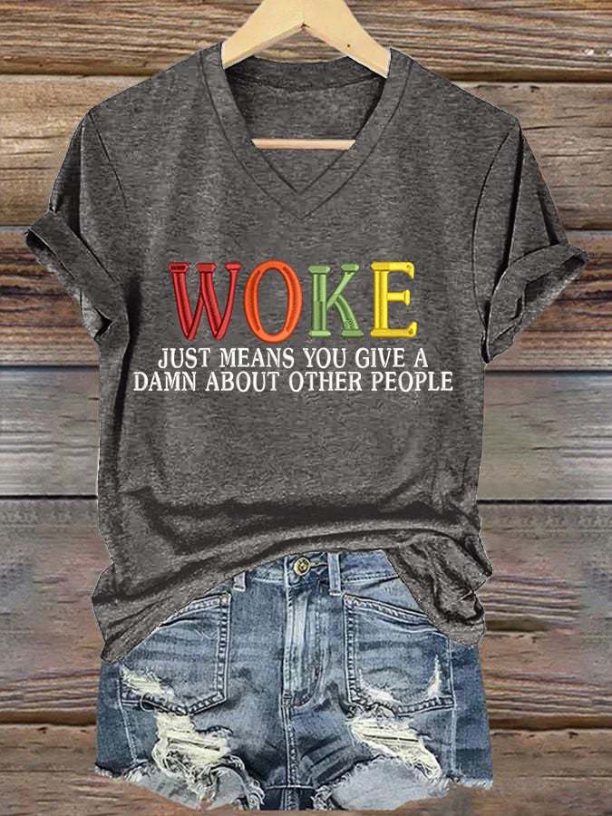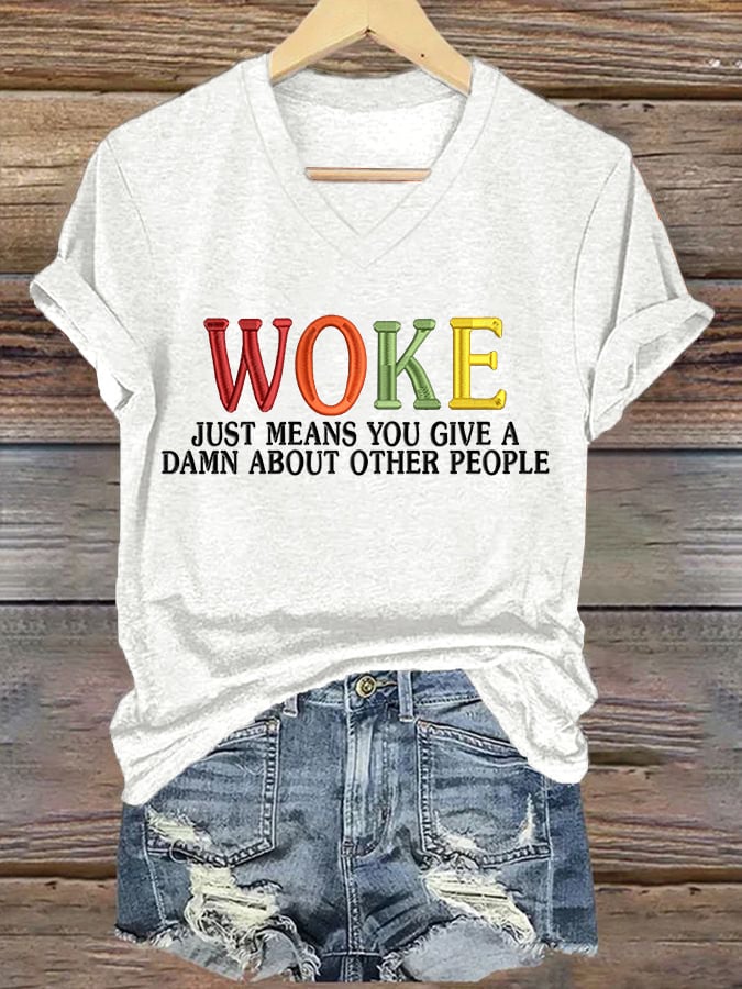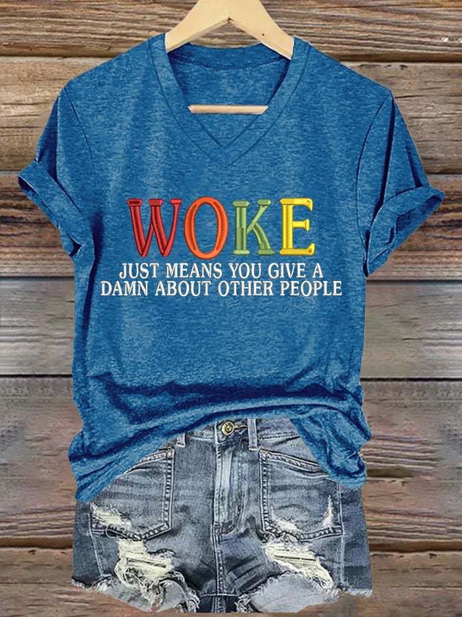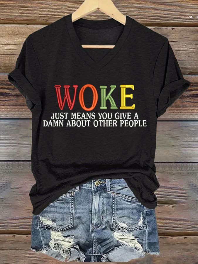 V-Neck Retro Woke Just Means You Give A Damn About Other People Print T-Shirt