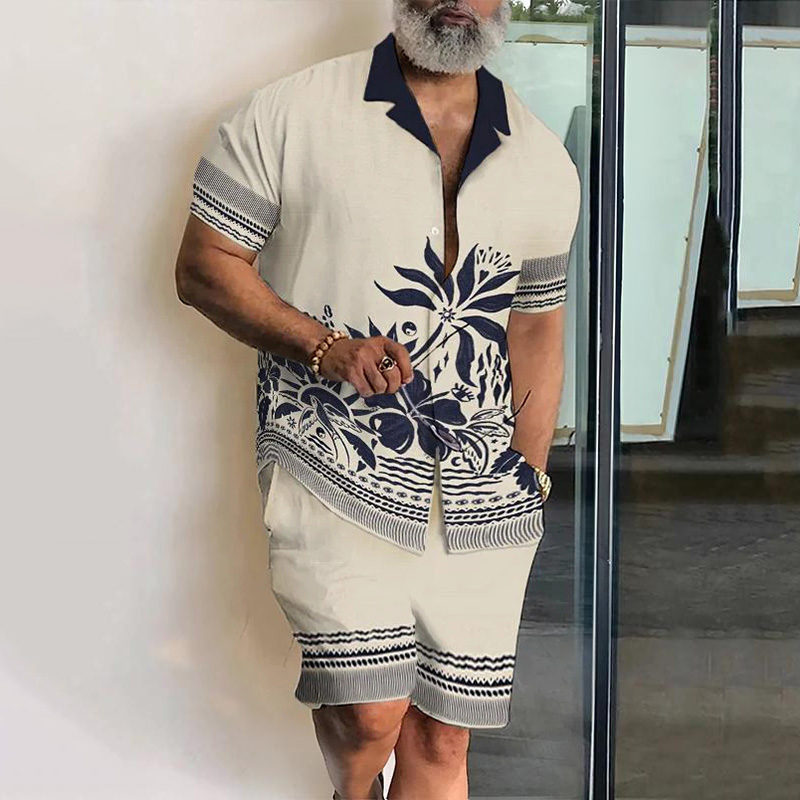 Vacation Casual Ethnic Botanical Printed Cuban Collar Short Sleeve Shirt Set