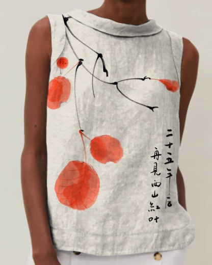 Vintage Art Print Cotton and Linen Round Neck Sleeveless Top