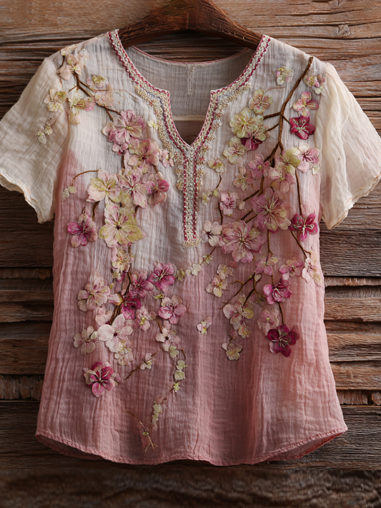 Vintage Cherry Blossom Embroidery Artistic Gradient Cotton Linen Casual V-neck Top