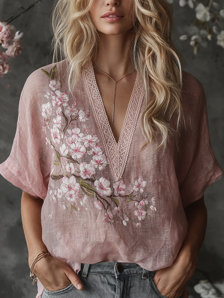 Vintage Cherry Blossom Embroidery Patchwork Lace V-neck Linen T-shirt