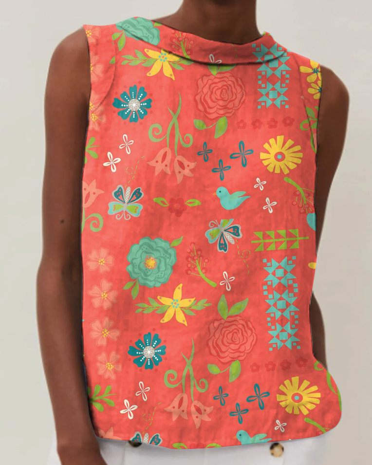 Vintage Floral Print Cotton and Linen Round Neck Sleeveless Top