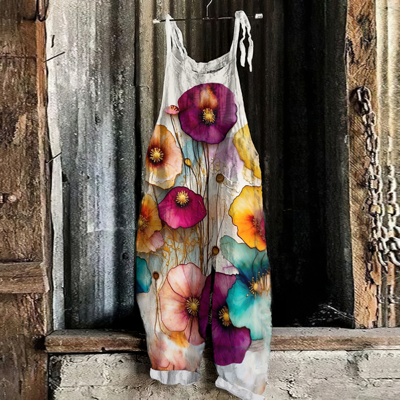Vintage Gorgeous Flowers Graphic Casual Loose Jumpsuit