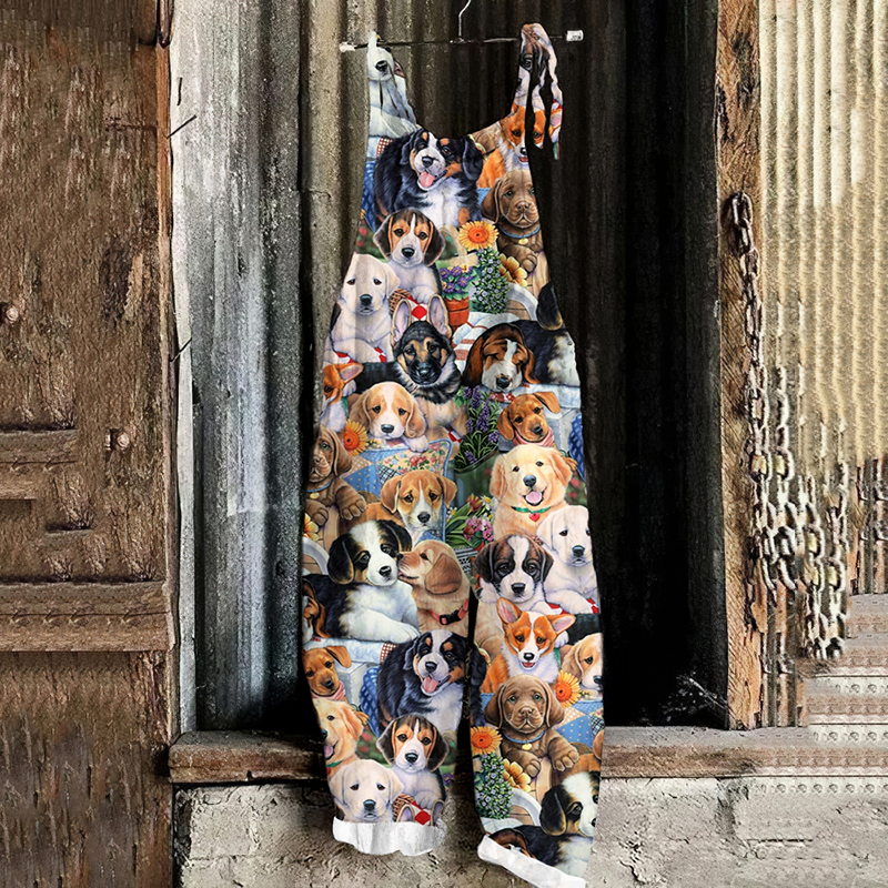 Vintage Puppies Sitting In Floral Print Loose Jumpsuit