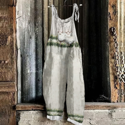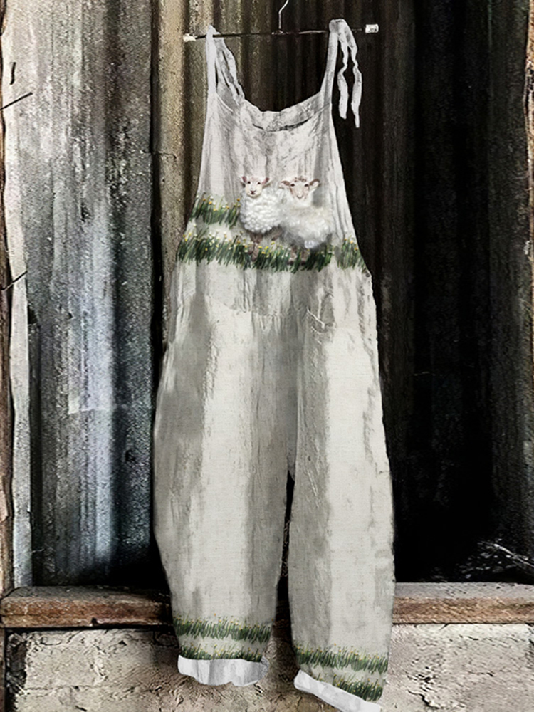 Vintage Sheep Linen Blend Loose Casual Jumpsuit