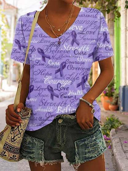 Women's Alzheimer's Awareness Love Hope Cure Strength Believe Print V-Neck Tee