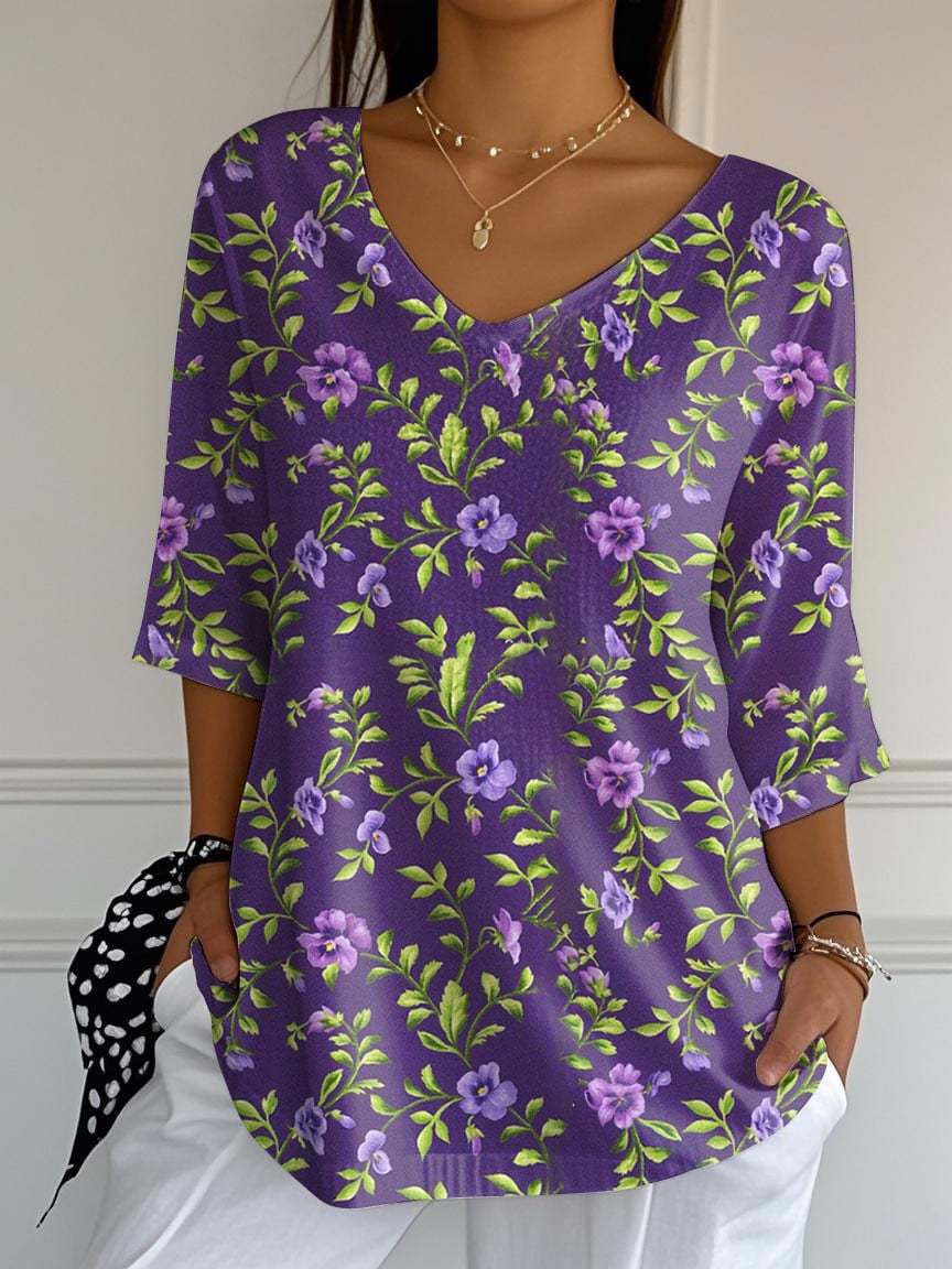 Womens Alzheimer's Awareness Purple Floral Print Casual V Neck T-Shirt