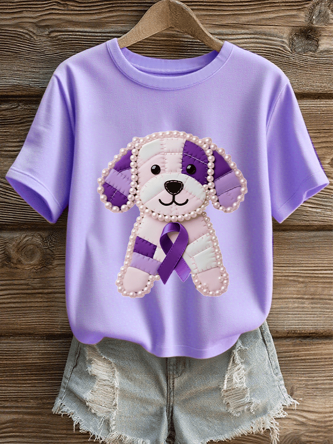 Women's Alzheimer's Purple Cute Dog Print Crew Neck T-Shirt