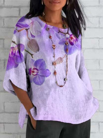 Women's Alzheimer'S Purple Flowers Print Round Neck Loose Shirt