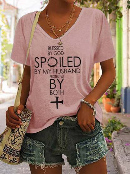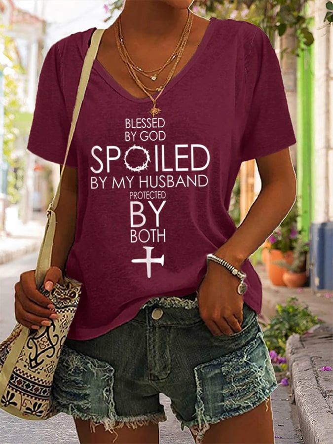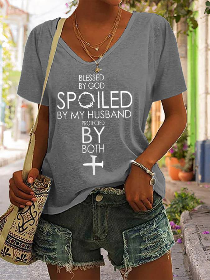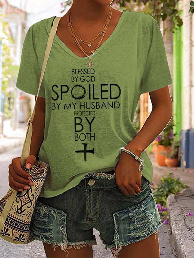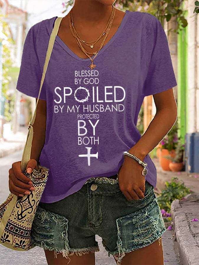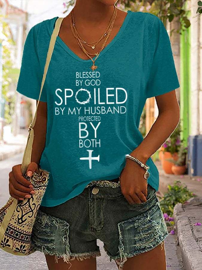 Women's Blessed By God Spoiled By My Husband Protected By Both Casual V-Neck Tee