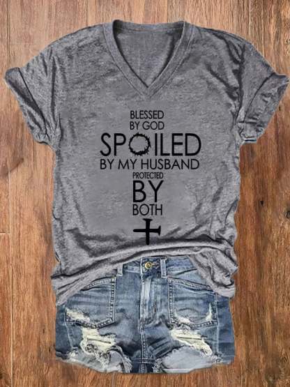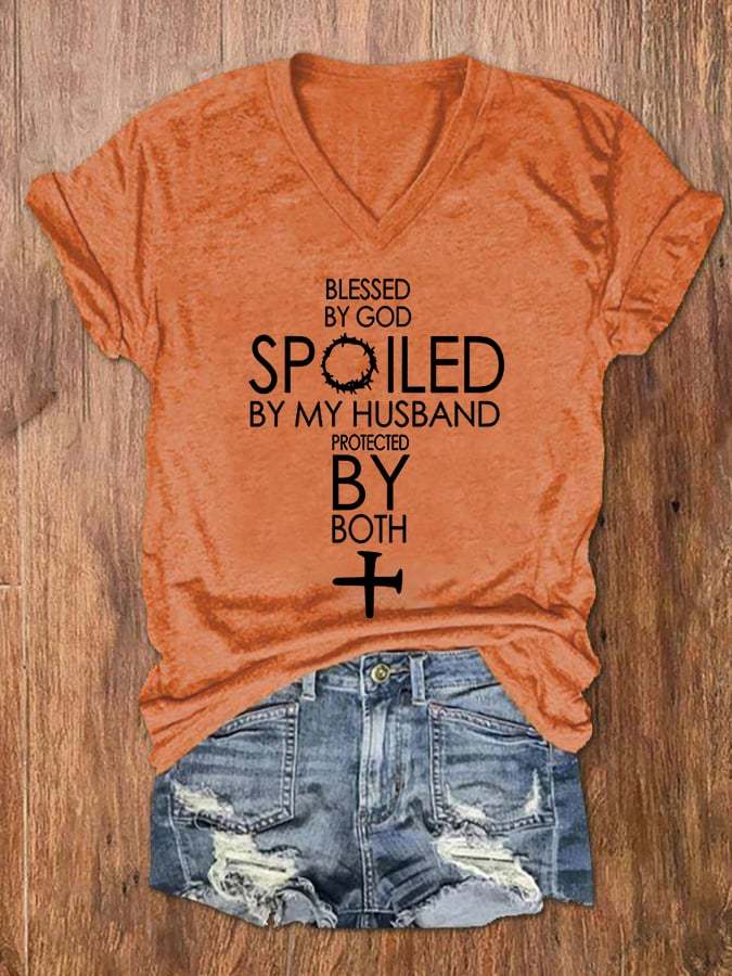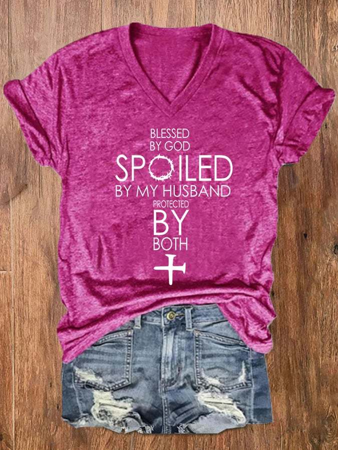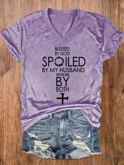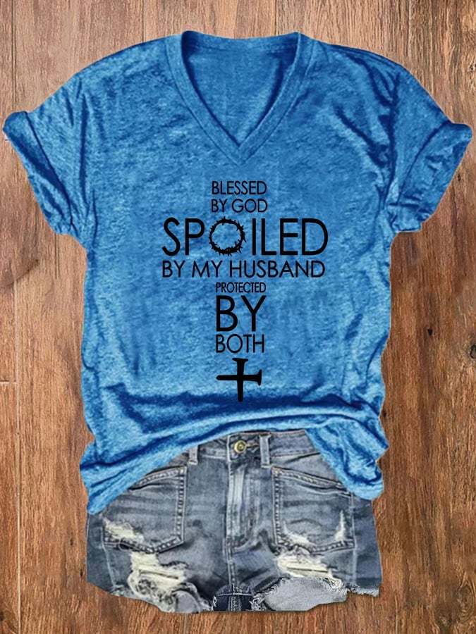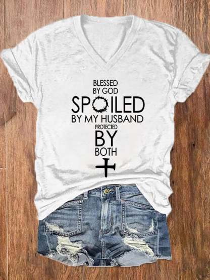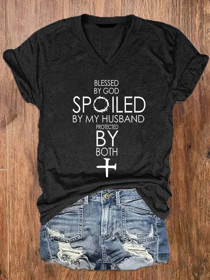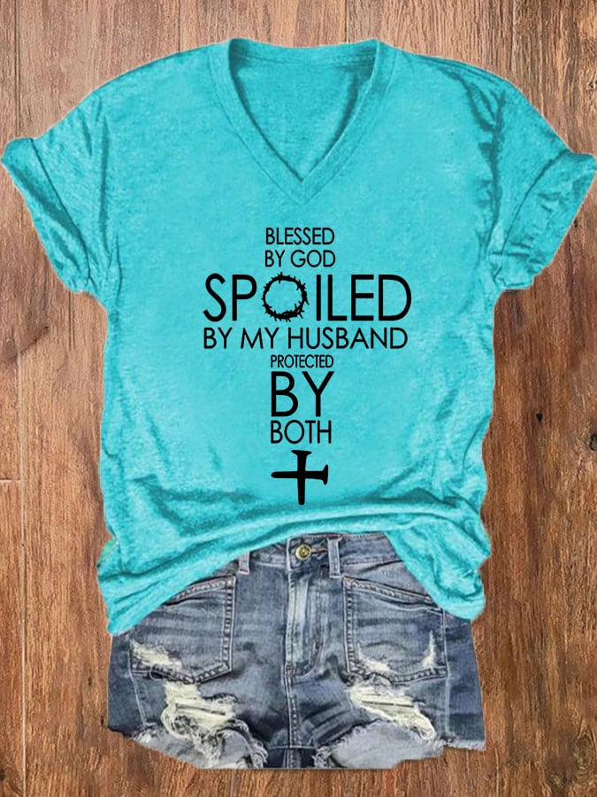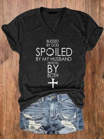 Women's Blessed By God Spoiled By My Husband Protected By Both V-Neck Tee