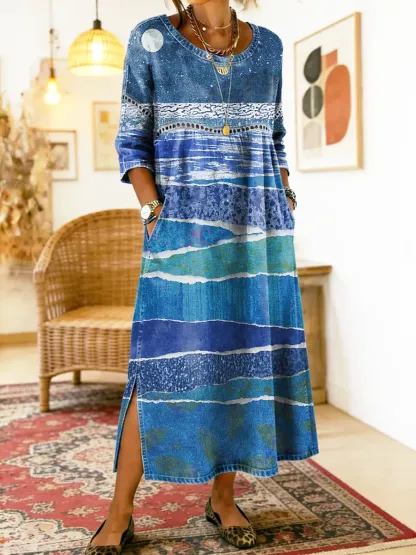 Women's Blue Moon Collage Art Print Patchwork Cotton Denim Dress