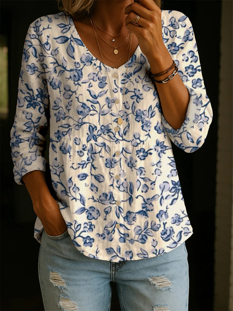 Women's Blue Vintage Flowers Print Casual Cotton Shirt