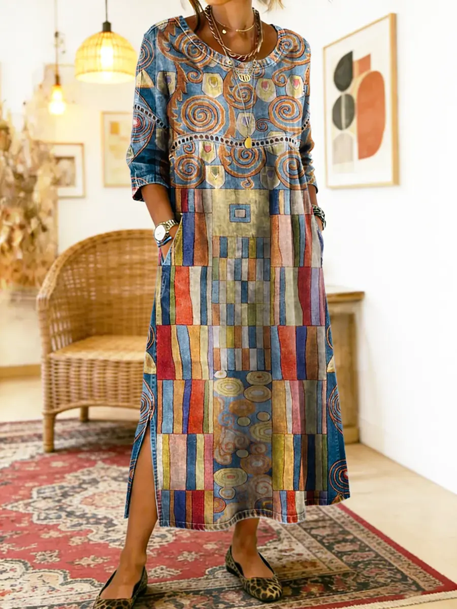 Women's Bohemian Geometric Pattern Art Print Cotton Denim Dress With Lace Trim