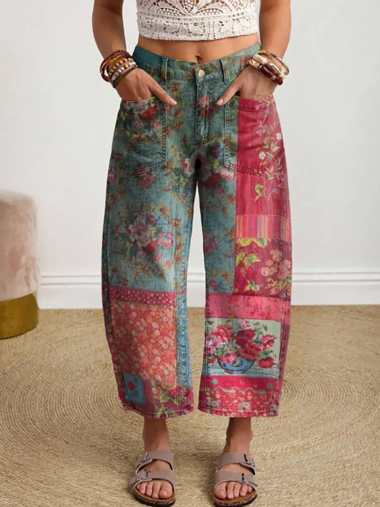Women's Bohemian Patchwork Floral Art Print Denim Jeans