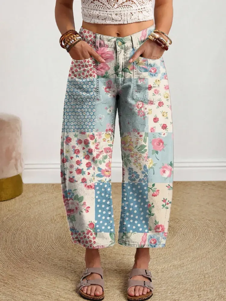Women's Bohemian Style Floral Patchwork Art Print Denim Jeans