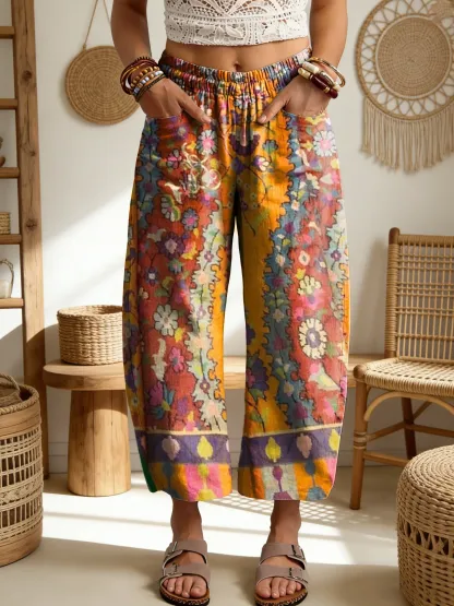 Women's Boho Floral Art Print Elastic Waist Pocket Cotton Pants