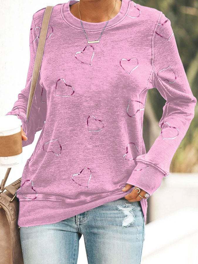 Women's Breast Cancer Awareness Heart Print Long Sleeve Casual T-Shirt