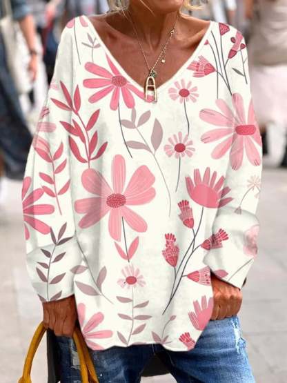 Women's Breast Cancer Pink Flower Print Casual Long Sleeve T-Shirt