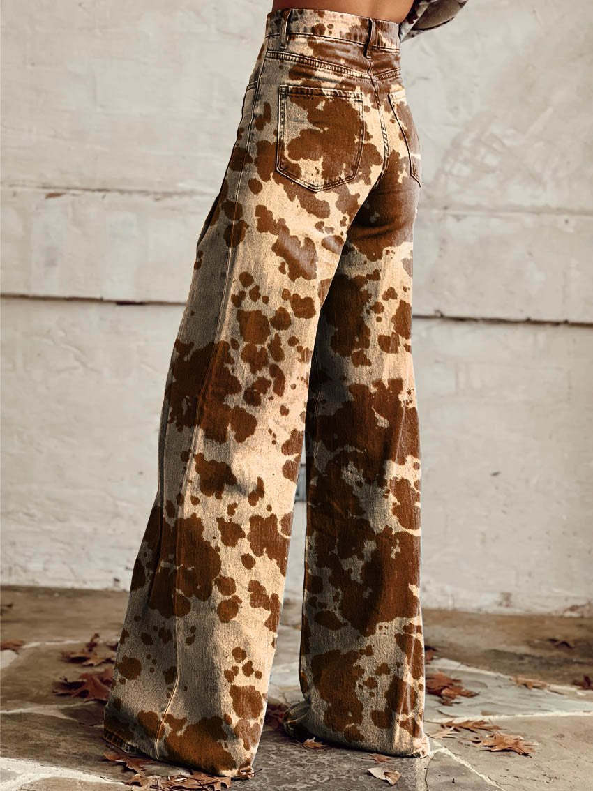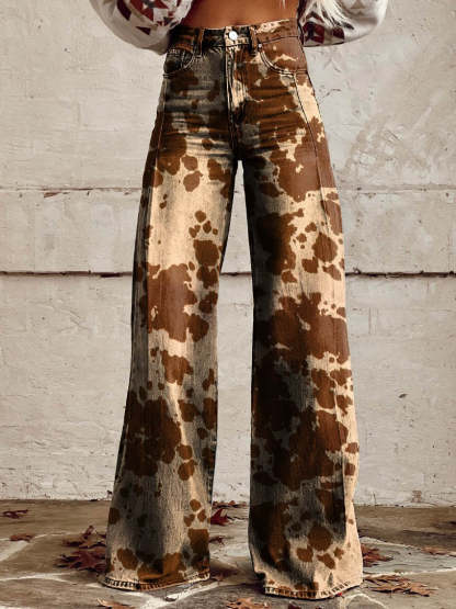 Women's Brown Cow Texture Print Casual Wide Leg Pants