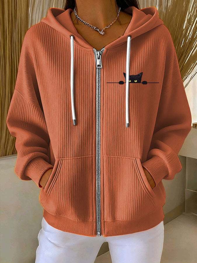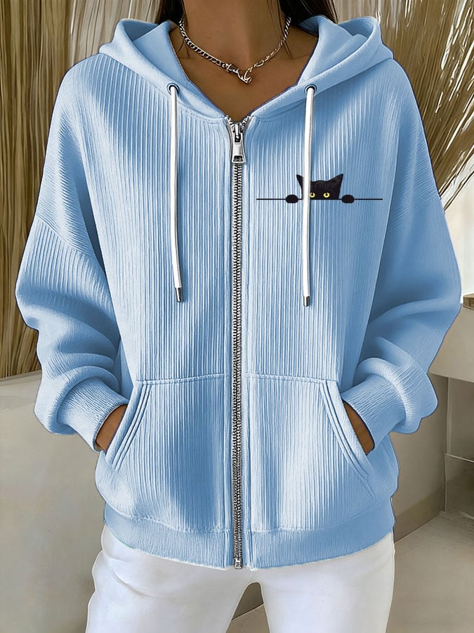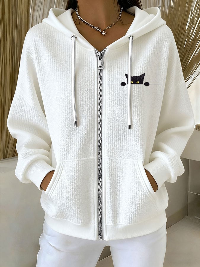 Women's Casual Cat Print Textured Sweatshirt Jacket