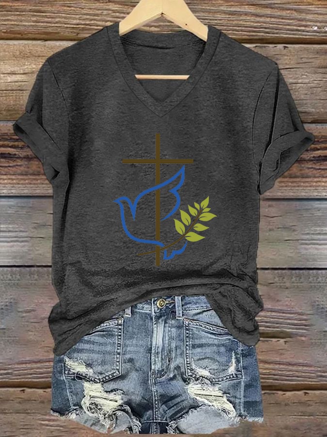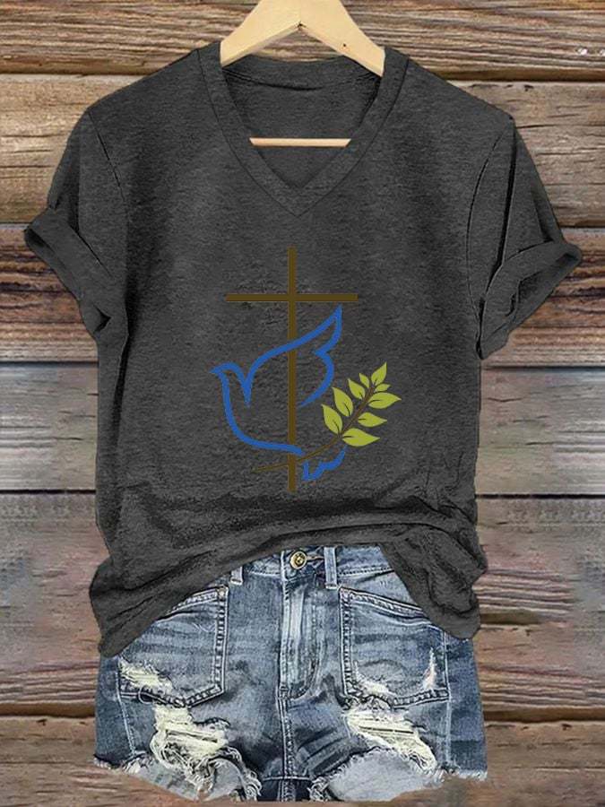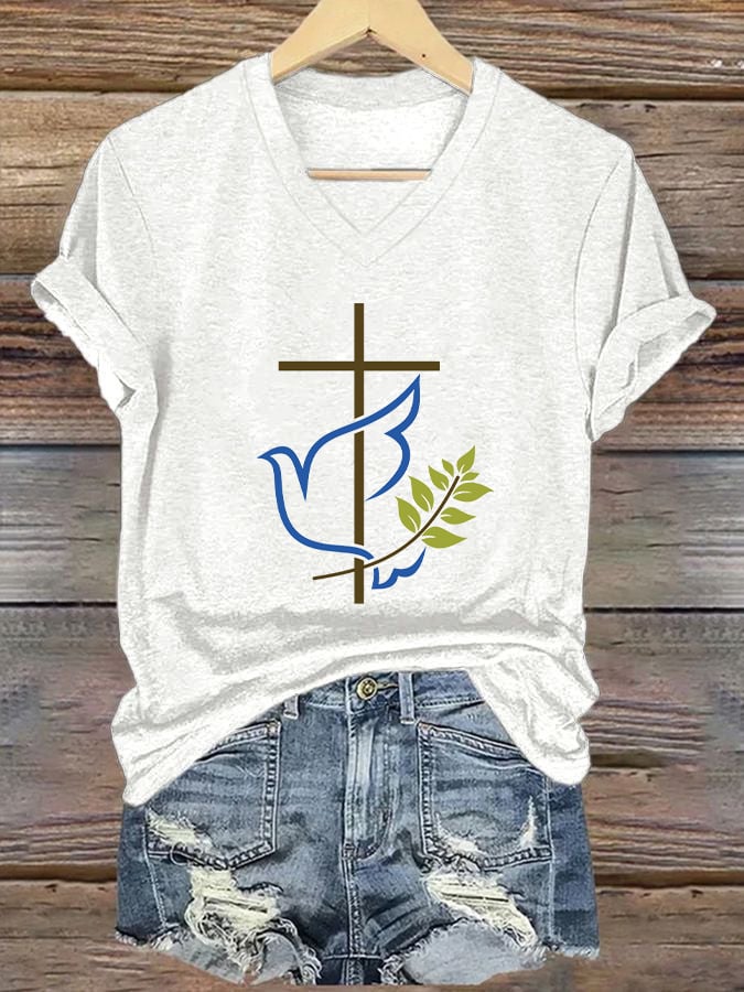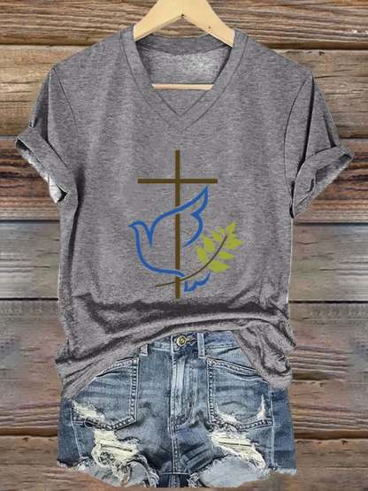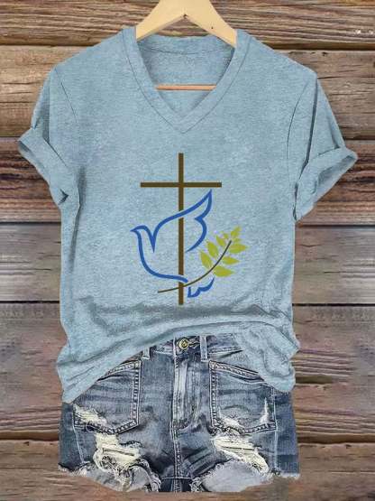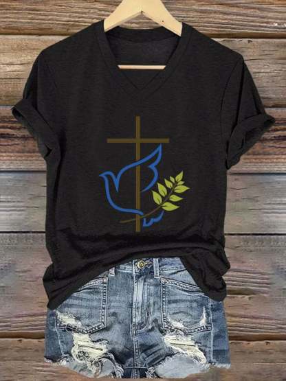 Women's Casual Christian Faith Cross Printed V-Neck Short Sleeve T-Shirt