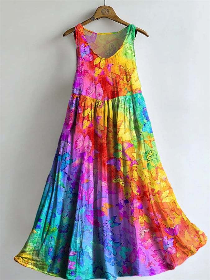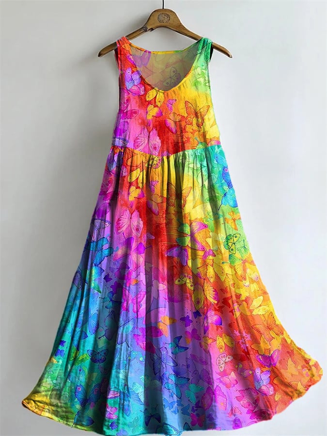 Women's Casual Cotton And Linen Rainbow Butterfly Dress