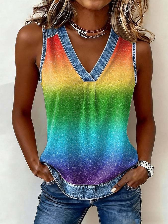 Women's Casual Denim Vest with Colorful Gradient Sequin Print