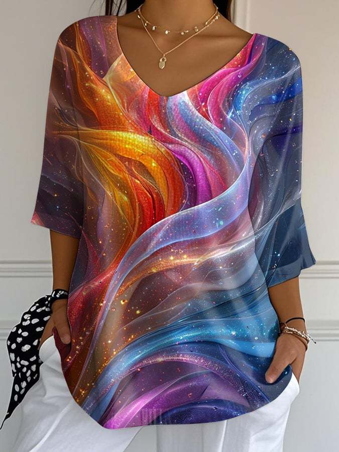 Women's Casual Fashion Rainbow Printed Bubble Wrinkled Cotton and Linen Top