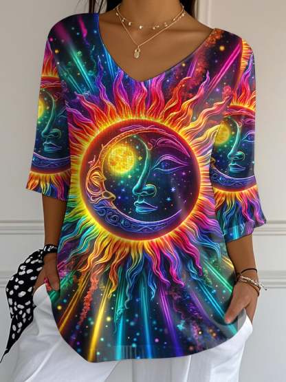 Women's Casual Fashion Rainbow Sun And Moon Print Bubble Wrinkled Cotton And Linen Top